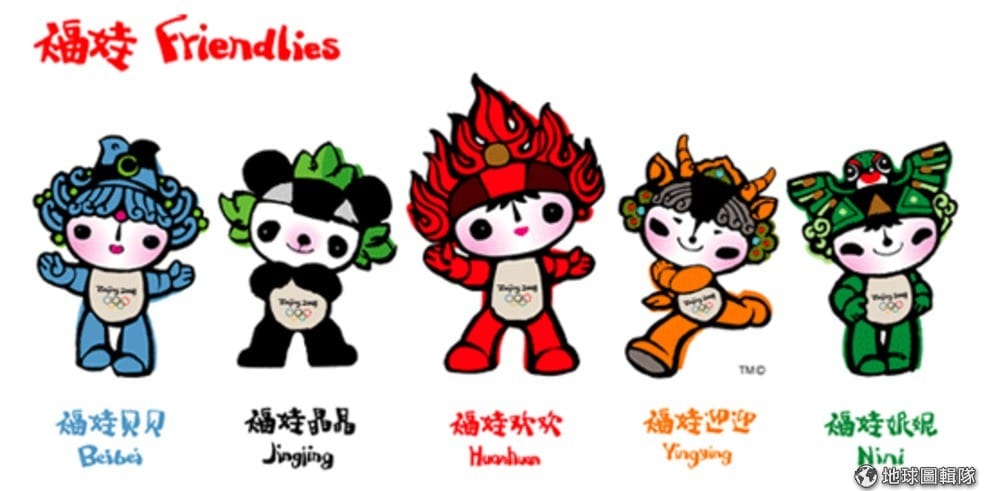 2008年中國北京奧運-鯉魚貝貝、大熊貓晶晶、藏羚羊迎迎、北京燕子妮妮(歡歡為奧林匹克聖火)
