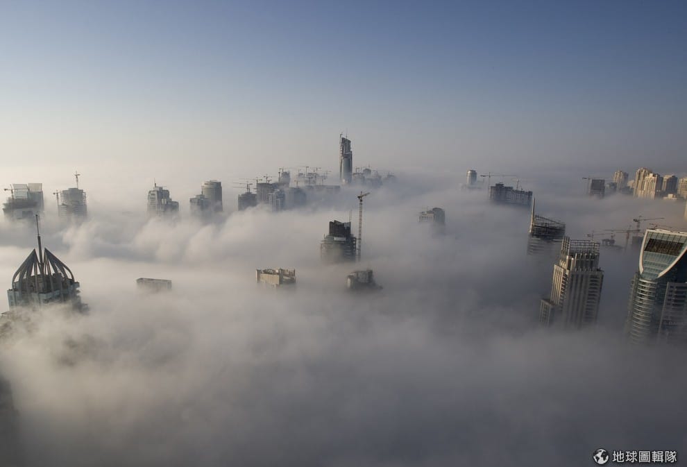 摩天大樓彷彿快被濃霧吞噬,11月的早上,厚重濃霧降臨降臨杜拜碼頭區,早上的交通因而大亂,多家航班也因此被迫取消。