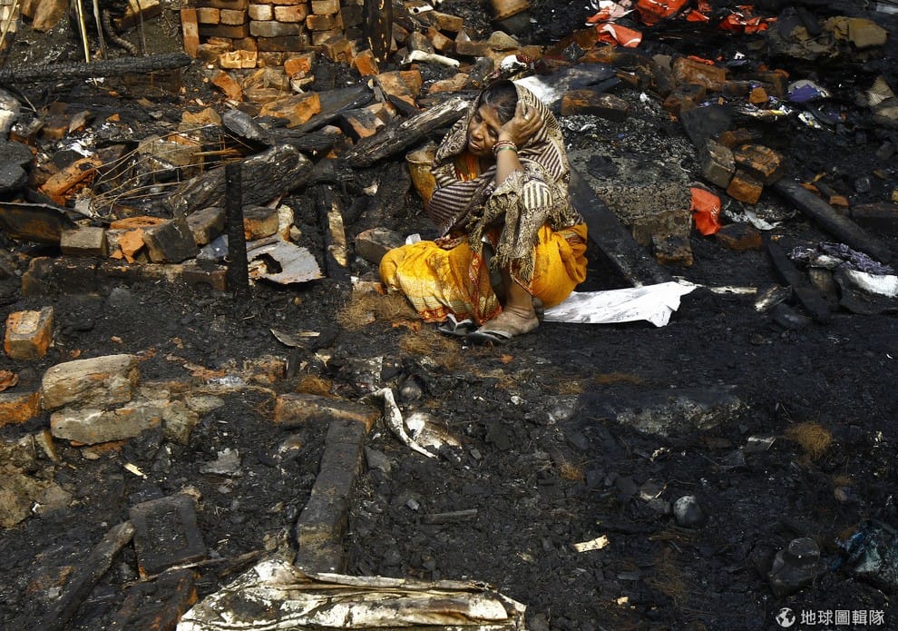加爾各答的貧民窟傳出大火,62歲的塔拉姆妮(Taramuni Ray)難過地看著自己的家被大火燒成灰燼。