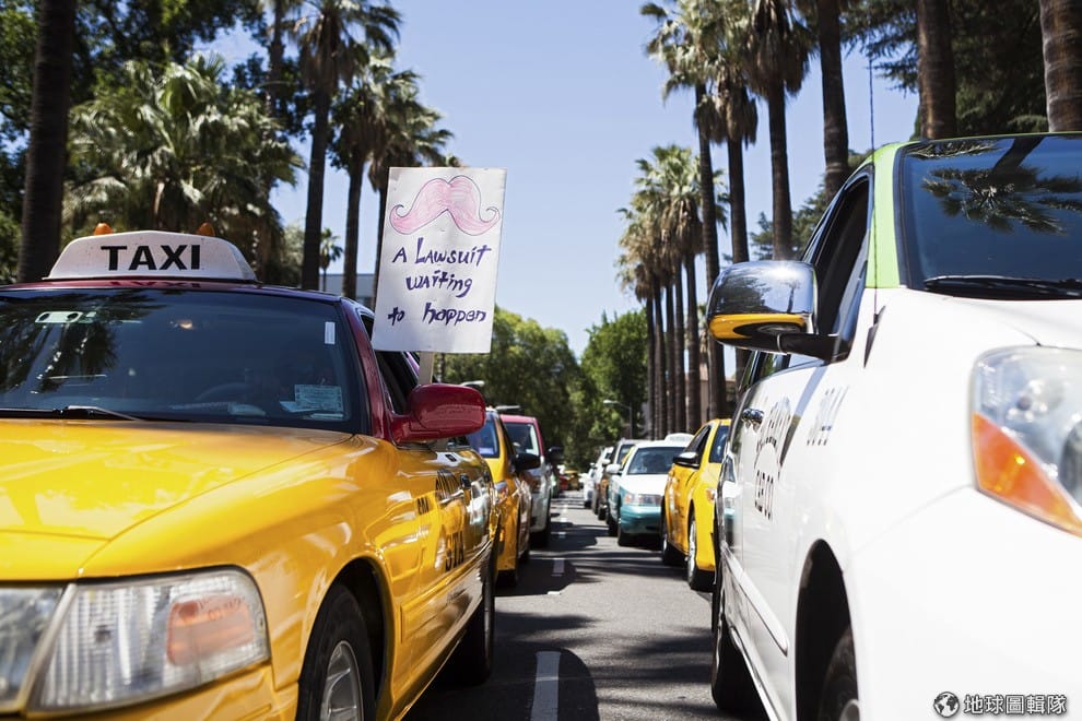 路透社Uber叫車服務出現後,這間公司在世界各地都引起不少計程車業者抗議,照片中是美國當地抗議Uber服務的計程車隊。