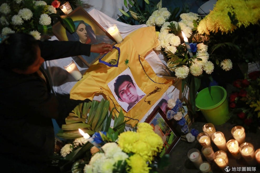 路透社示威民眾拿著失蹤學生亞歷山大的黑白照片遊行。