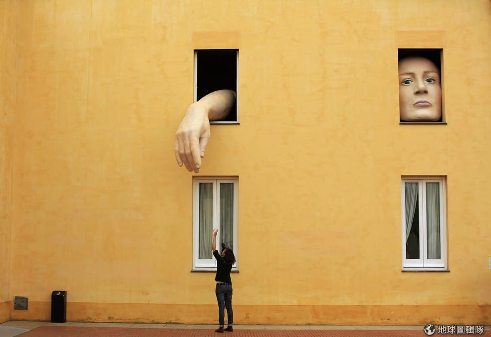 一名女性在藝術作品愛麗絲(Alice)前面拍照,這個作品是由西班牙藝術家盧卡斯創作(Cristina Lucas)。