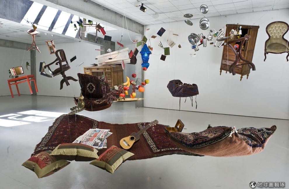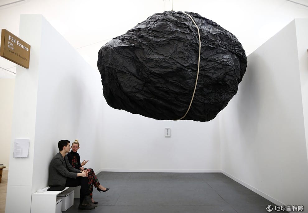 藝廊工作人員坐在藝術品「理論」(Teoria)底下,這個作品是由藝術家芭蘇拉多(Eduardo Basualdo)創作的。