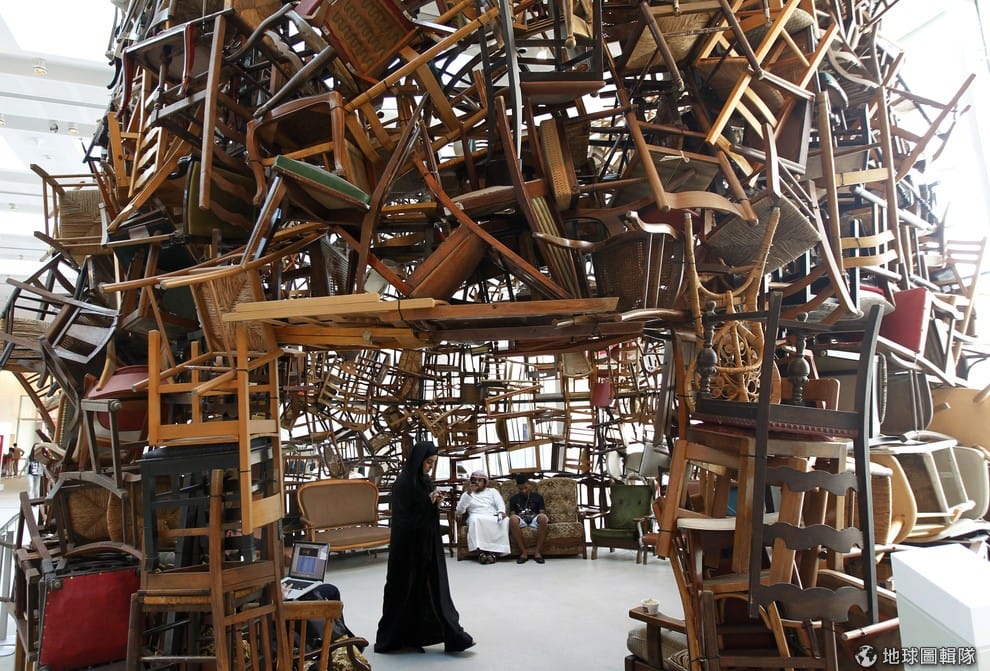 來參觀的民眾走進日本藝術家川俣正創作的作品「椅子」(Chairs)。