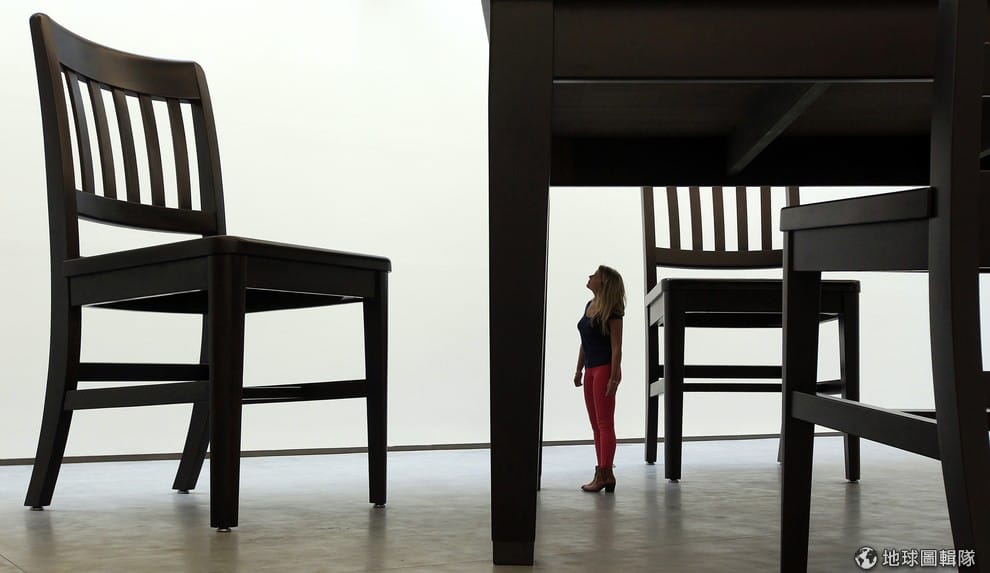 一名女性站在巨大的桌子和椅子中間,這些巨大的桌椅並不是巨人家裡的家具,而是由藝術家羅伯特(Robert Therrien)創作的紀念雕刻作品。