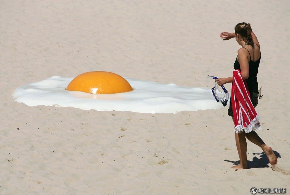 一名女性走近藝術品「巨無霸小雞」(Big Chook),這隻巨無霸小雞是澳洲藝術家帕尼爾(Jeremy Parnell)用玻璃纖維和高亮度船舶專用油漆做成的。藝術家帕尼爾表示,人們躺在沙灘上試著烤黑自己身體的景象,給了他創作這個作品的靈感。