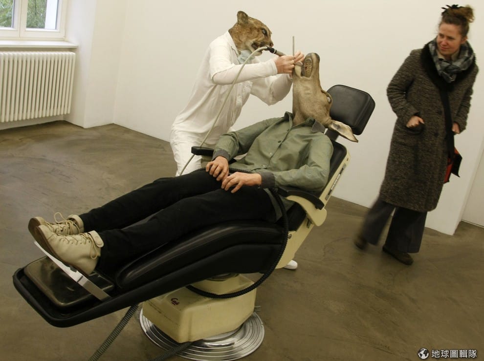 參觀民眾經過藝術品「美洲獅牙醫」(Puma-Dentist),這個作品是奧地利藝術家森格(Deborah Sengl)用塑膠、蠟、美洲獅的頭和雌鹿的頭所做出來的。