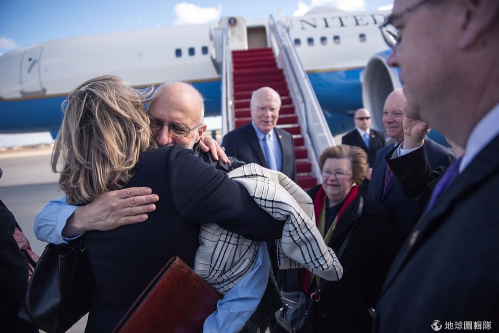 重返家園的美國人質格羅斯,下機後激動地和人擁抱。
