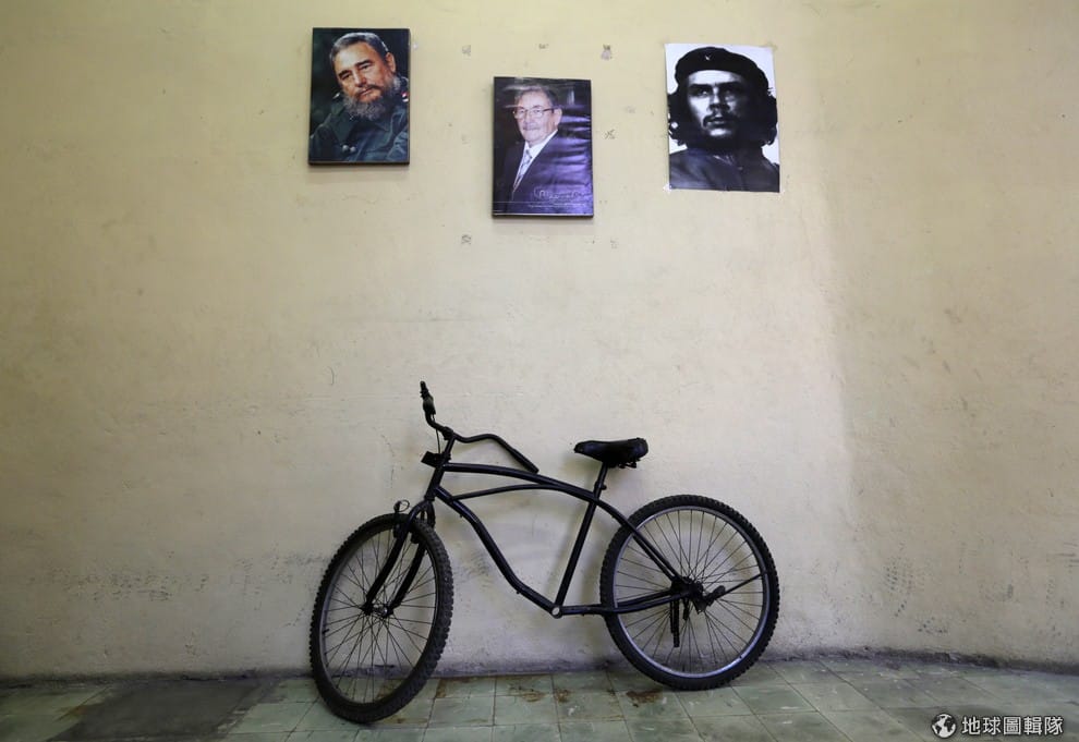 哈瓦那一間建物中,可見腳踏車停在古巴前領導人們的肖像下(左至右):前總統菲德爾‧卡斯楚(Fidel Castro)、現任總統同時是卡斯楚胞弟的勞爾‧卡斯楚(Raul Castro)以及革命英雄切‧格瓦拉(Ernesto 'Che' Guevara)。