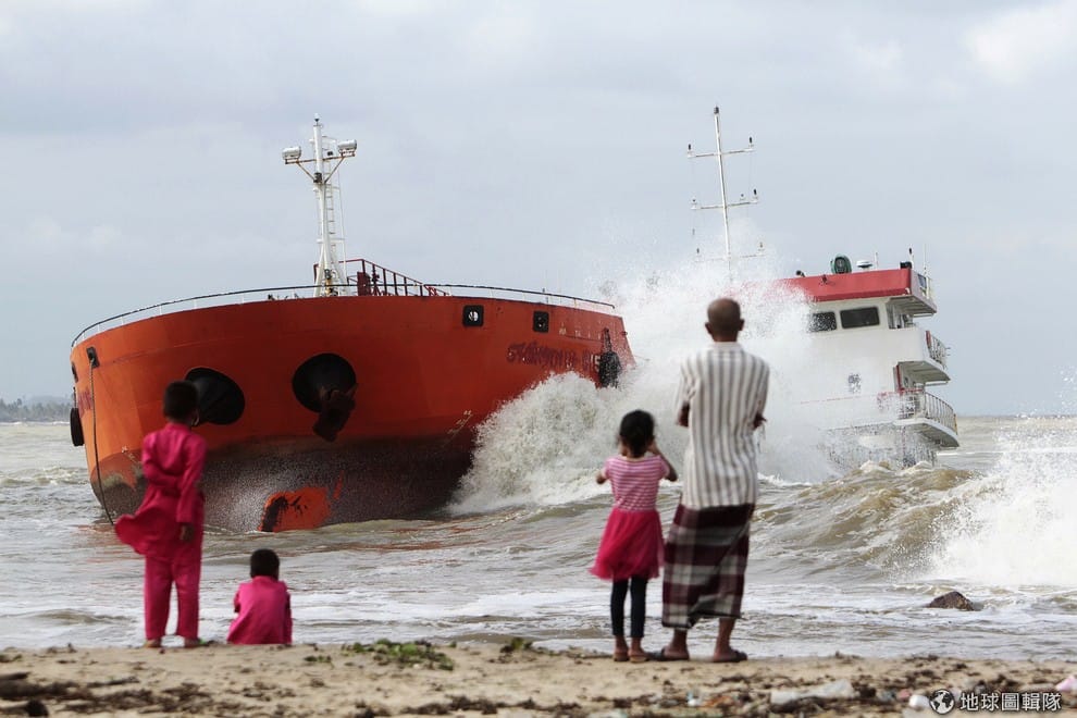 民眾站在岸邊看著大浪捲起,他們眼前的輪船載有大量橄欖油,這艘船原本被船員挾持,但之後被泰國官方拘留在離岸400公尺遠的地方,但19號這天的惡劣海象讓輪船被捲到其他地方。
