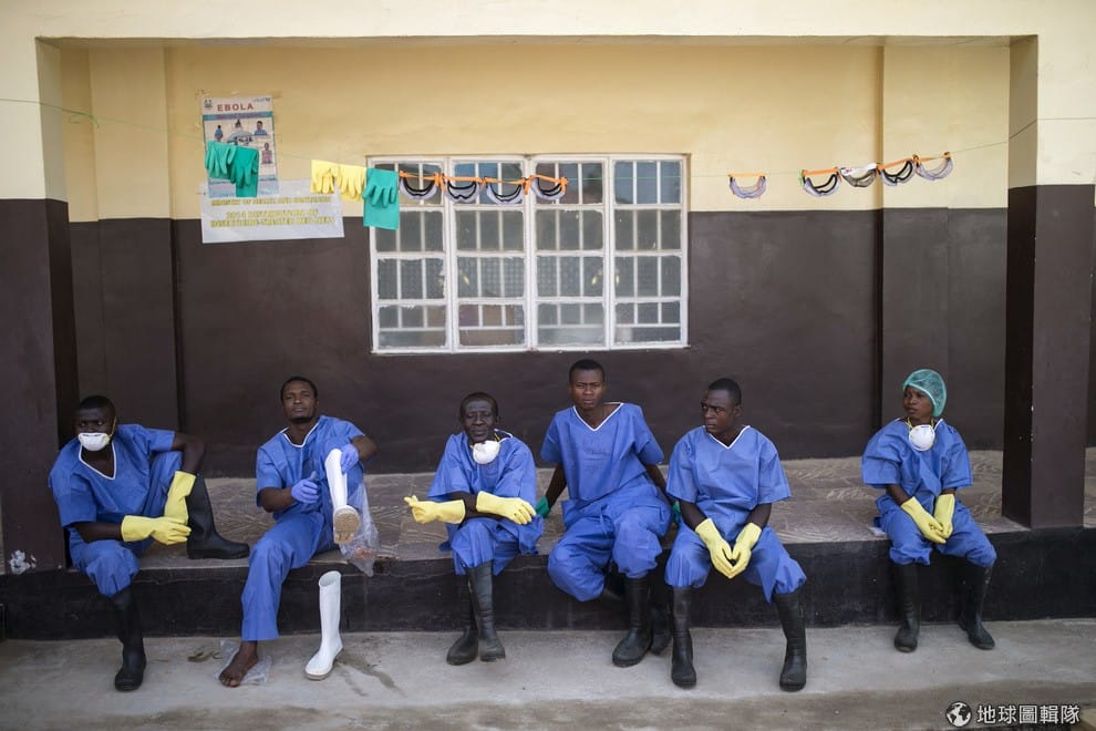 忙碌的醫護人員一起坐在紅十字中心外休息。伊波拉疫情在獅子山當地持續延燒當地的18,603起疑似病例中,有一半以上都是確診病例。