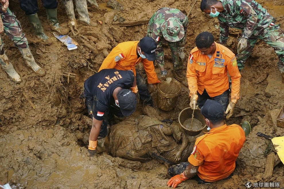 搜救人員合力將挖到的母子遺體從黃褐色泥土中搬出。印尼的班查爾尼卡拉縣(Banjarnegara)發生土石流災情,至少有88人不幸死亡。