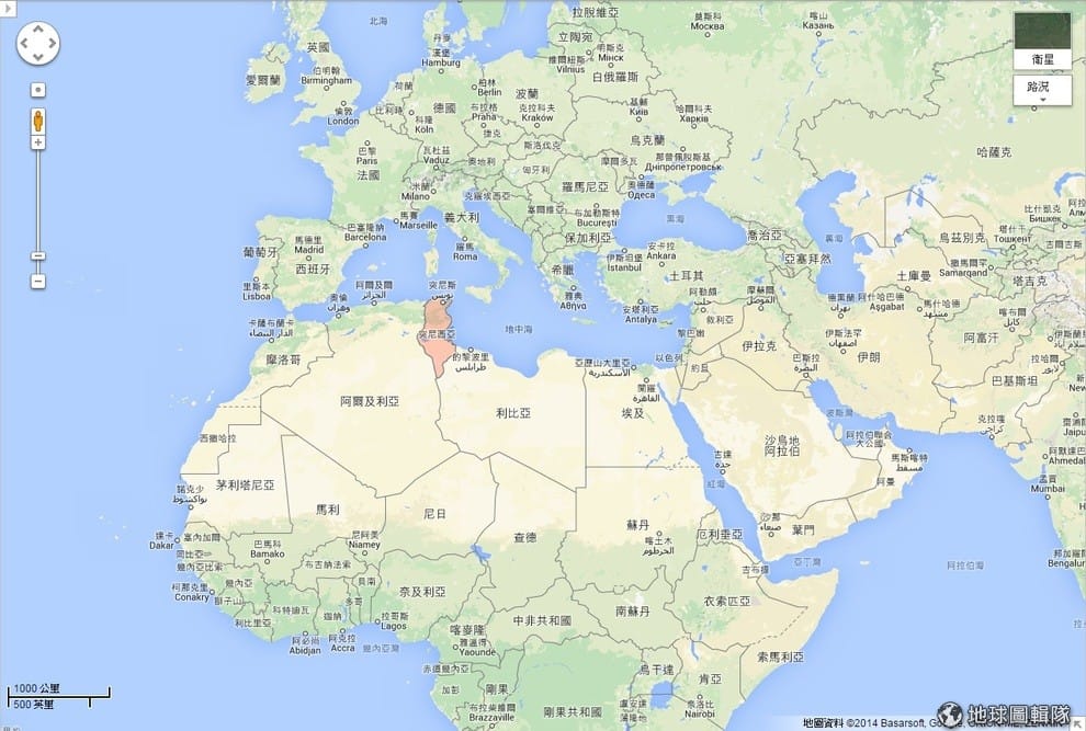 上圖的紅色區域是突尼西亞。