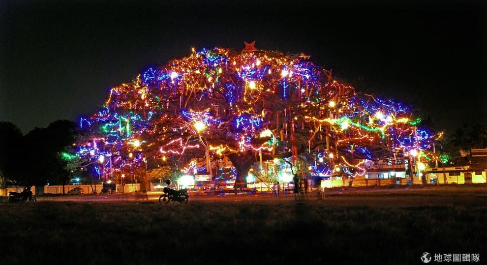 不像西方有尖尖的聖誕樹,印度用當地熱帶樹種取而代之,掛上美麗的燈飾慶祝聖誕。Photo credit: kodensan