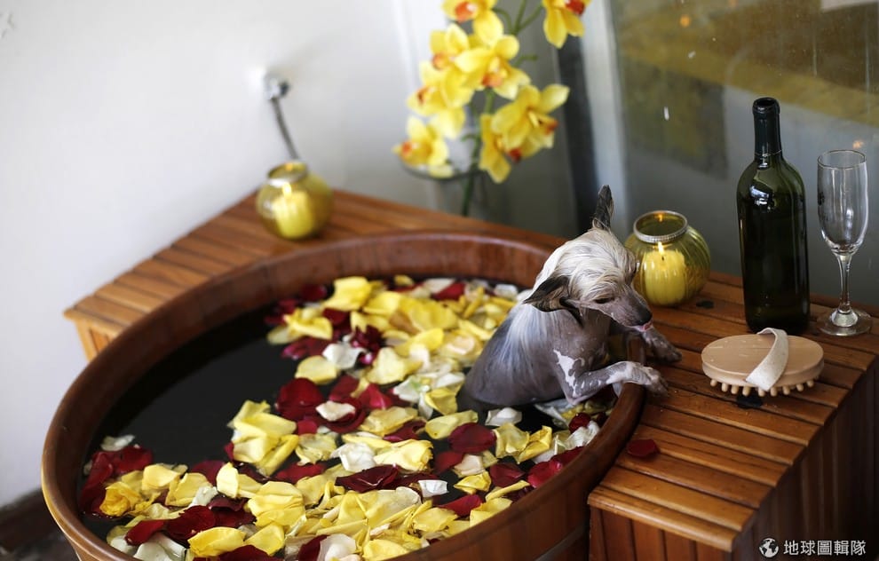 中國冠毛犬正在灑滿花瓣的澡盆中泡澡。
