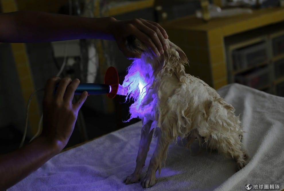 路透社洗完澡後,美容師拿著紫外線光替狗狗美容。