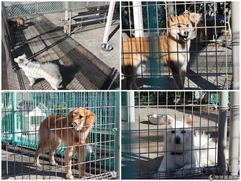在收容所廣場曬太陽放風的狗狗們,這裡也供人與狗狗互動。何宜/攝