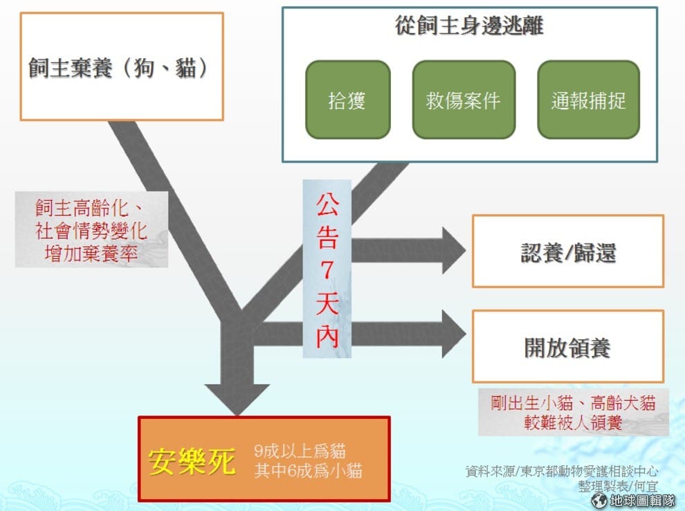 除此之外,東京的收容流程和台灣也有很大的不同,飼主帶到收容所棄養的貓狗會直接安樂死,而只有拾獲、救傷及捕捉的狗能有7天的收容期限,比台灣的12夜更短!