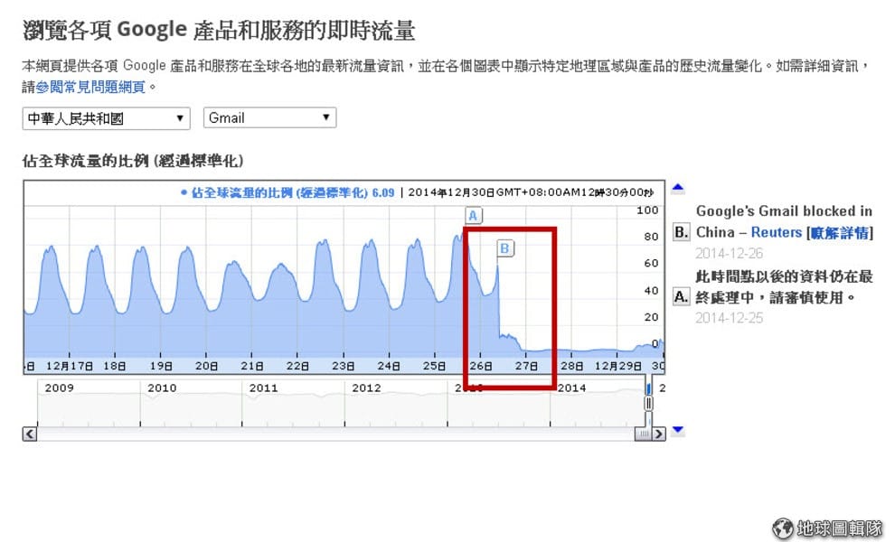 根據Google公布的流量資訊,可以發現中國方面的Gmail使用量在上周出現暴跌現象。