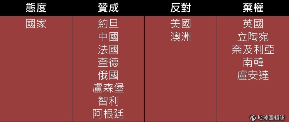 這次的投票中,投下反對票的國家分別是美國和澳洲,以色列的同盟夥伴美國再一次表達了他們對草案的反對,BBC報導中也提到,即使提案通過,美國也會動用否決權否決這項提案。另一方面,舉手贊成的國家有8個,其中包括了俄國和法國。