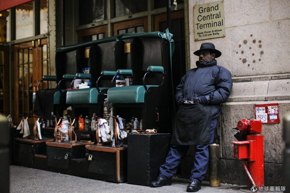 圖為一名擦鞋匠正在等待客人上門,空盪盪的座位上一個人都沒有。