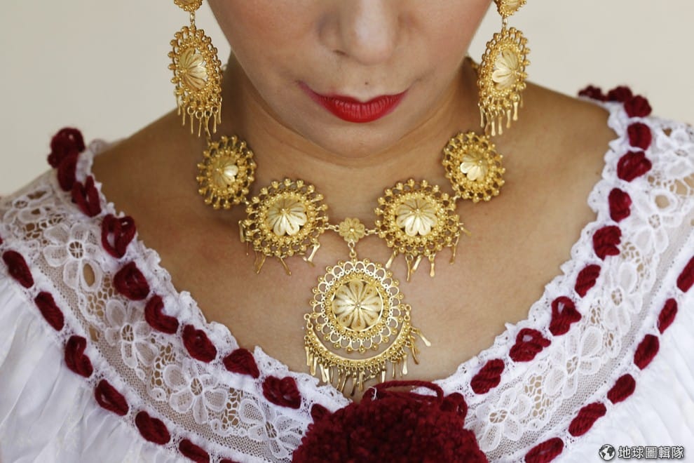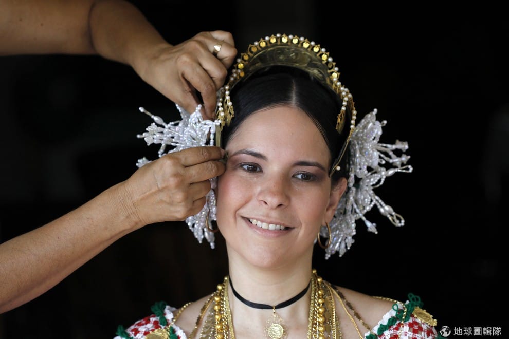 一名女子配戴整套華麗金飾,穿上巴拿馬的傳統服飾波利拉裙,準備參加一年一度的波利拉裙大遊行。
