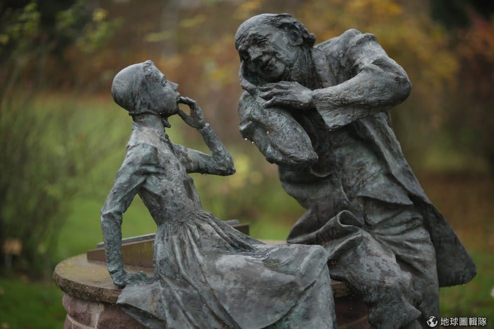 在「童話之路」中,可以看到許多和格林童話有關的銅像,照片中的老先生正在跟孫女講童話故事。圖片來源:Sean Gallup/Getty Images