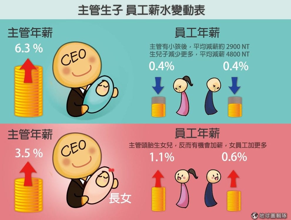 他們的研究顯示,當企業CEO有小孩後,員工的薪水通常會縮水0.2個百分比,換算一下,大概是一年100美金(約新台幣2,900),更不妙的是,如果是生兒子的話,薪資縮水幅度會到0.4個百分比。相反地,男性主管自己的薪水則會成長,生兒子薪水會成長6.3個百分比,生女兒則也有3.5個百分比。