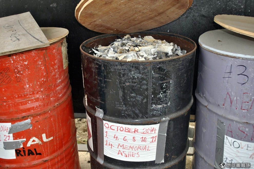 賴比瑞亞當地火葬場外,一個個巨大鐵桶中裝滿伊波拉罹難者的骨灰,無言地說著伊波拉疫情最嚴重時的殘酷現實。