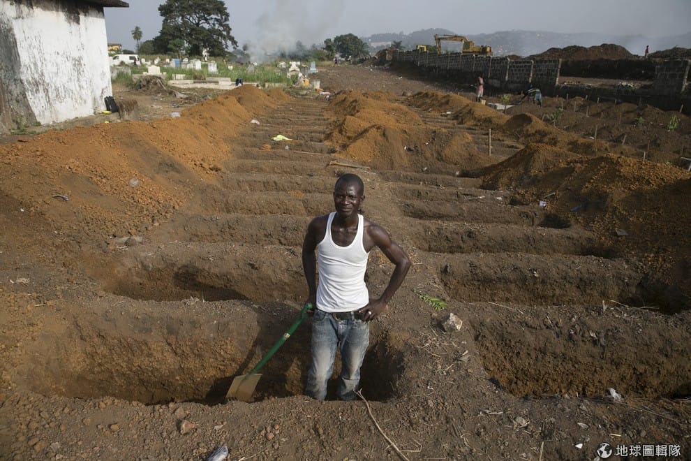 路透社獅子山當地一處掩埋死者的墓園,負責掩埋工作的人員站在挖好的坑洞中。