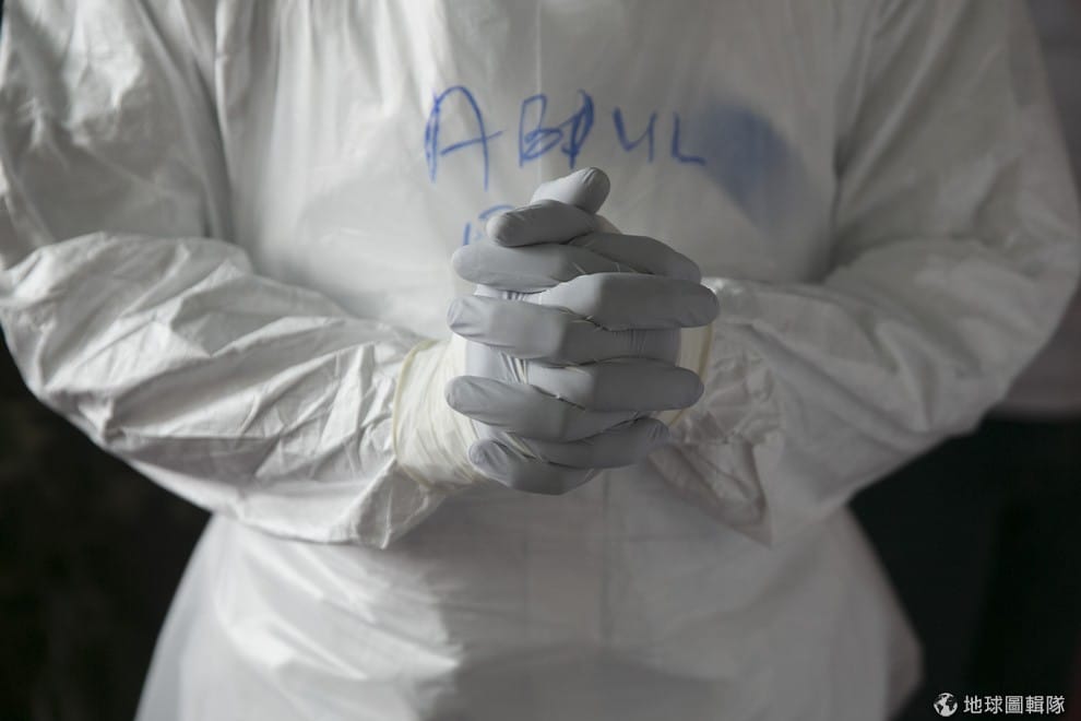 路透社前線的醫療人員必須用層層的防護保護自己,照片中是賴比瑞亞疫區的工作人員,他們在一天工作開始前進行禱告。