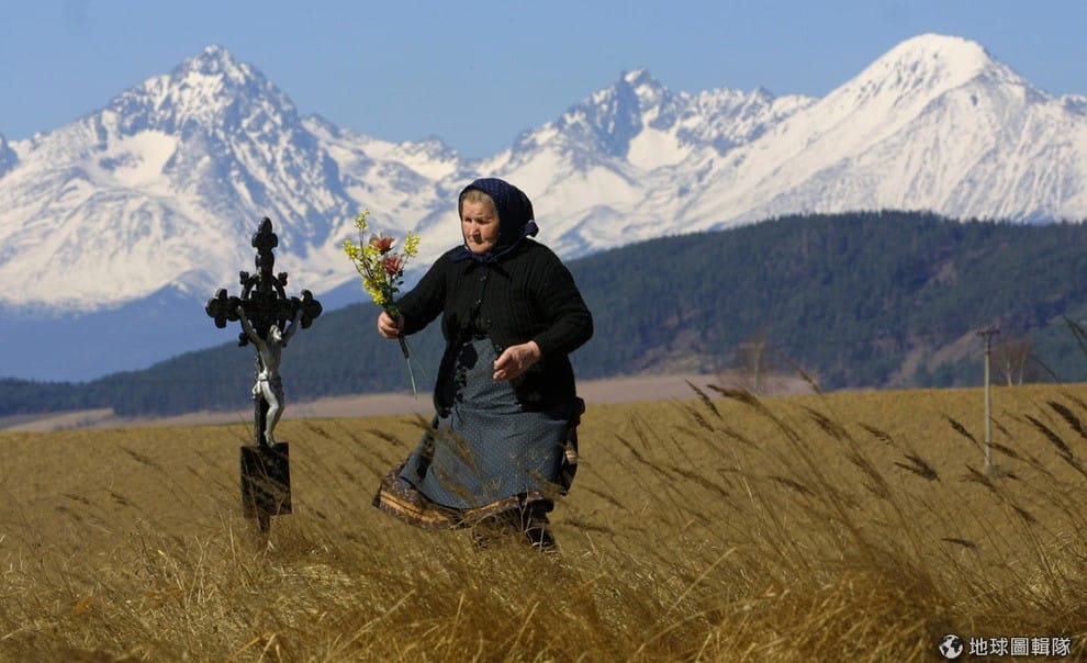 70歲的老奶奶獻花給無名墓,她的背後是雪白的上塔特拉山。