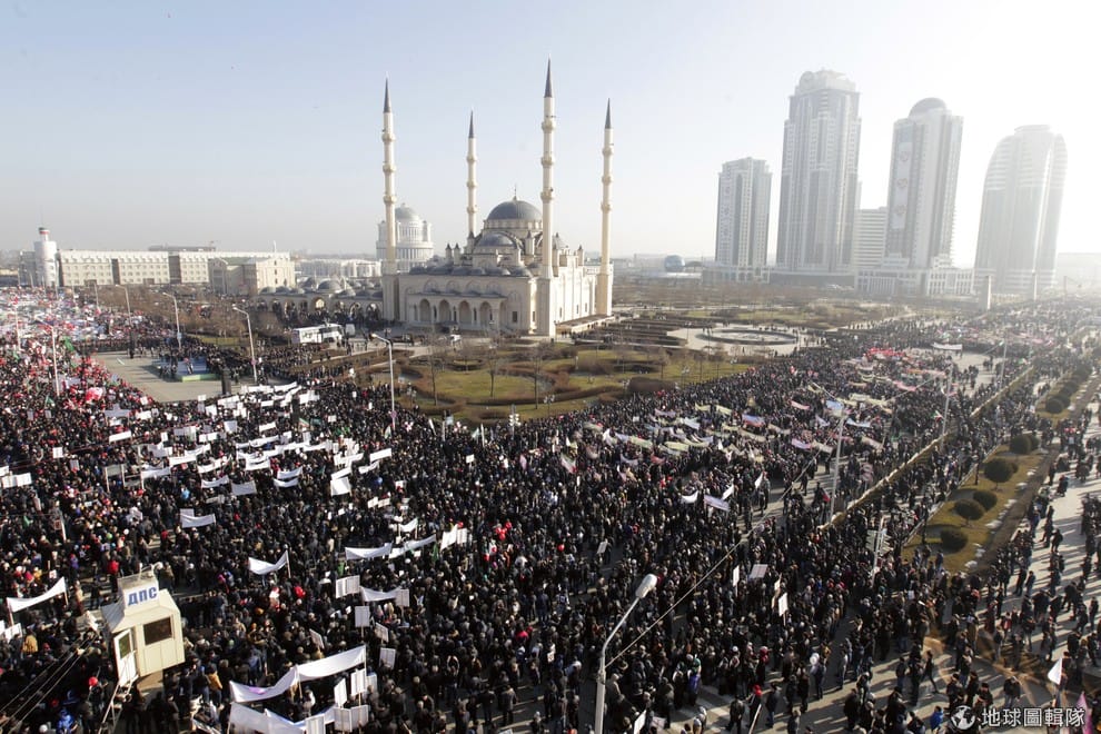 俄羅斯的自治國「車臣共和國」(Chechnya)出現大規模示威人潮,當地民眾聚集在首都格羅茲尼(Grozny)抗議法國雜誌《查理周刊》諷刺伊斯蘭先知穆罕默德,當地民眾主要信仰就是伊斯蘭教。車臣的穆斯林領袖以「粗魯與不道德」批評《查理周刊》的諷刺漫畫。照片中遠處可見當地的清真寺。
