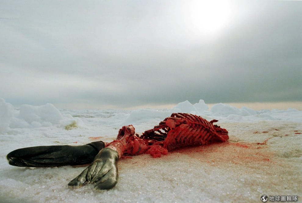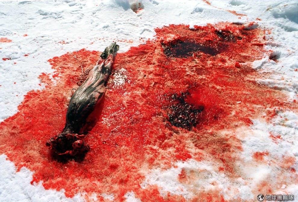 繼續閱讀 皮被剝下後的海豹屍骸就被丟在冰面上,滿滿的鮮血讓白色的冰面都快看不見了...。圖片來源:Darren McCollester/Newsmakers