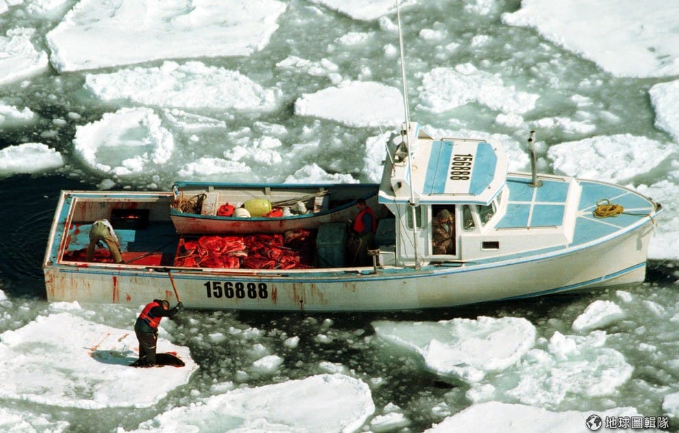 加拿大當地的獵捕海豹船隻,船上滿是流出鮮血的海豹屍體,冰面上的獵人正拿著木棒朝海豹頭部重重的打下去...。圖片來源:Darren McCollester/Newsmakers