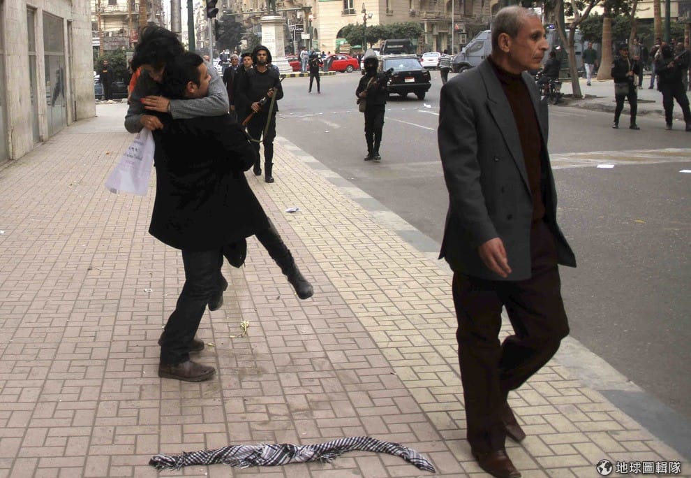 埃及革命屆滿4周年這天,不滿現況的民眾上街抗議,也與警方發生衝突。照片中的示威者把受傷倒地的同夥緊急抬往他處。