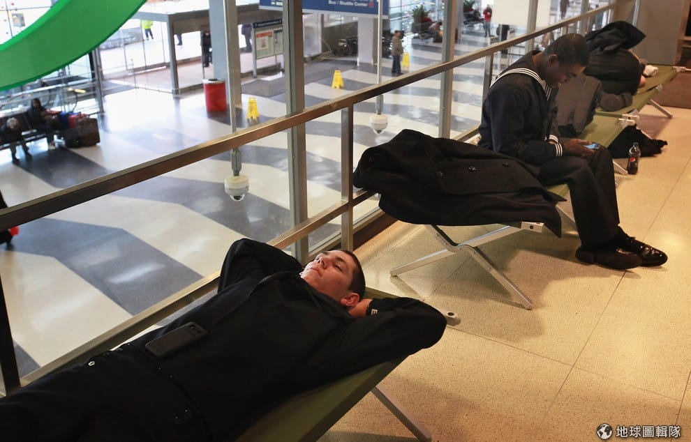 等著等著,就在機場椅子上打盹起來...。圖片來源:Scott Olson/Getty Images