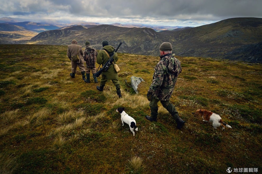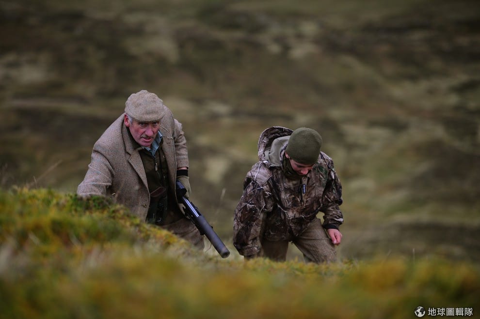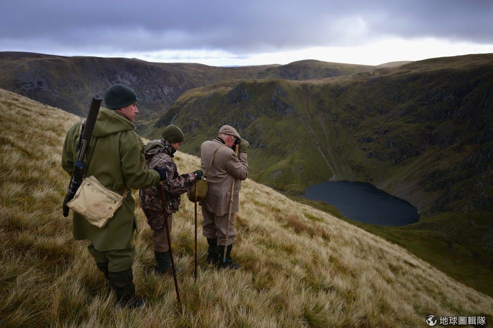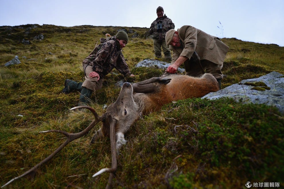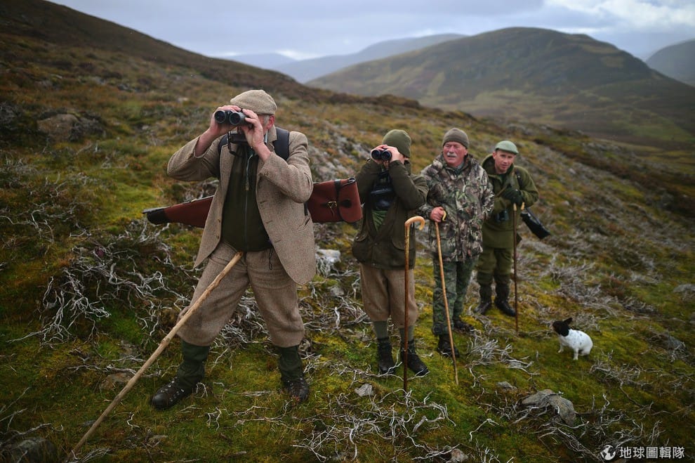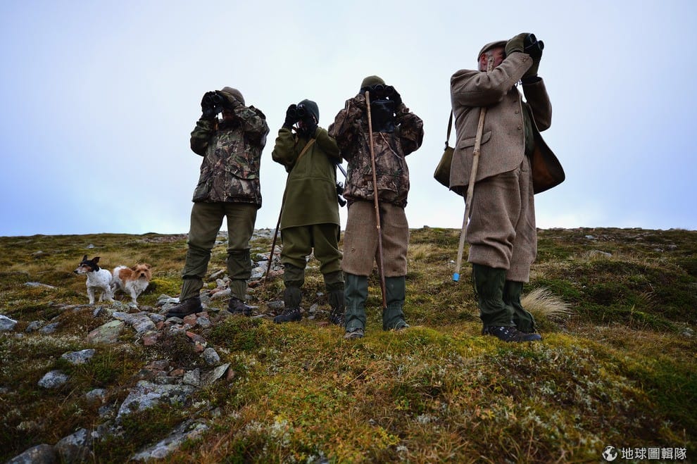 gettyimages獵人們隨著彼得一起找尋公紅鹿的蹤跡,遠方清澈的湖水和像是地毯一般鮮綠的植被景色,十分美麗。圖片來源:Jeff J Mitchell/Getty Images