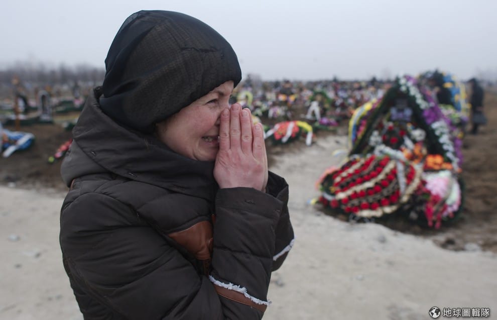 照片中的女性正在傷心哭泣,他的家人在馬里烏波爾攻擊中喪生。