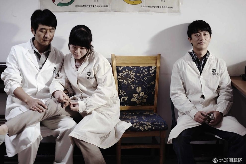 郭曉東(左)飾演一位全盲推拿師傅王大夫,帶著女友小孔(左2,張磊 飾)私奔回南京,並投靠老友沙老闆開設的推拿中心,他夢想著努力工作賺錢,準備未來和小孔一起開設自己的盲人推拿館。沒想到一場家庭金錢風暴,逼得他以最殘忍的方式表達抗議…。
