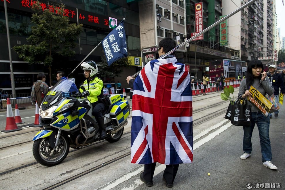 數十人在街頭高舉英國國旗,甚至有個人舉著「香港是英國」的牌子。
