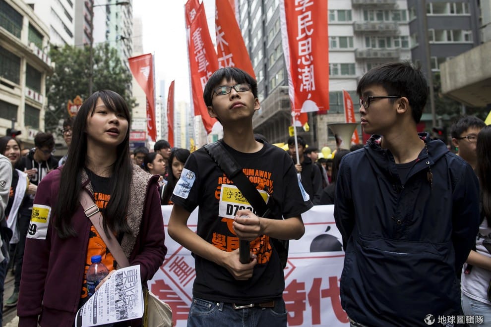 去年佔中時的學生領導人由左至右分別是周庭、黃之鋒與黎汶洛,他們周日重回街頭,要求香港真普選。