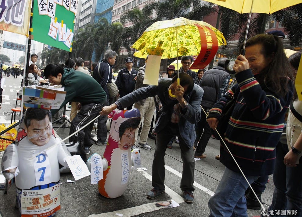 抗議現場擺放了香港特首梁振英的充氣玩偶,供抗議民眾洩憤。