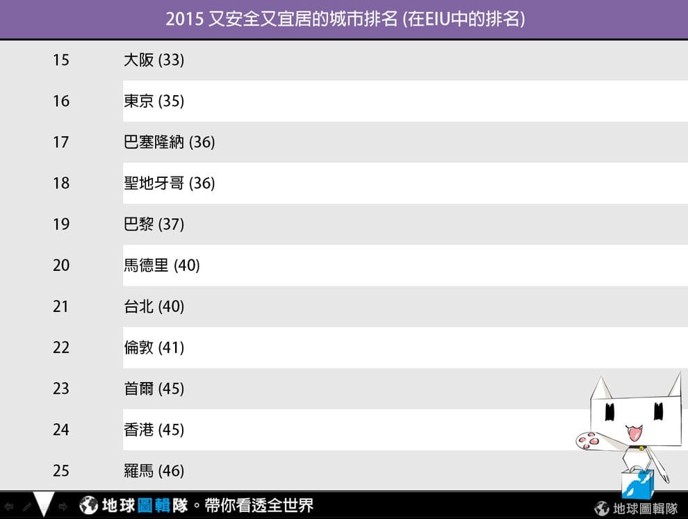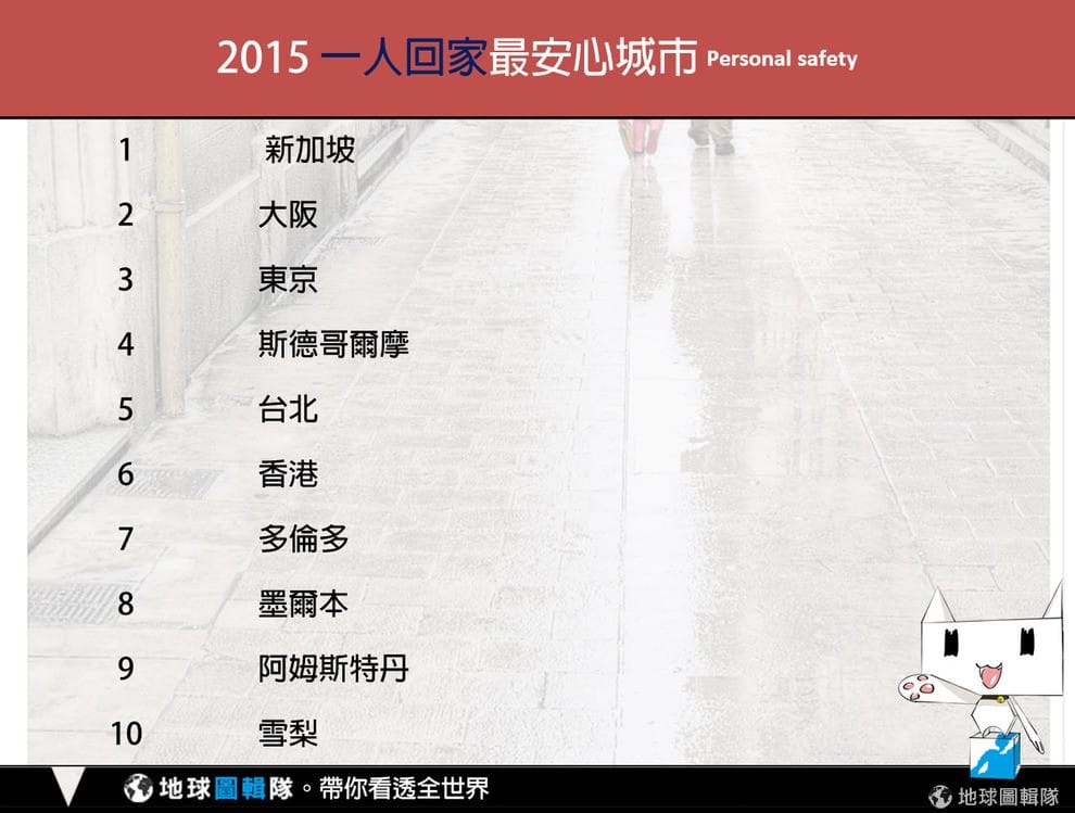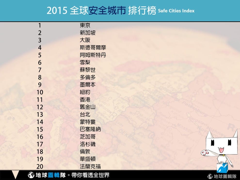 編註01:對《經濟學人》發布的安全城市報告有興趣的朋友,請至 "THE SAFE CITIES INDEX 2015"