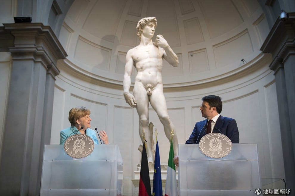義大利總理倫齊在上個月 23號時,在佛羅倫斯學院美術館內的大衛像前,與德國總理梅克爾共同召開聯合記者會。