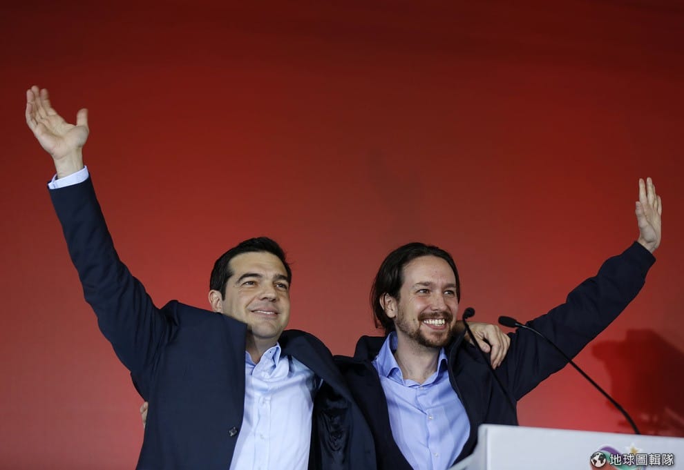 希臘激進左派聯盟勝選也掀起了南歐反撙節的風潮。西班牙左派政黨「我們能」祕書長伊格萊西亞(Pablo Iglesia, 右)和希臘總理齊普拉斯一起向支持民眾致意。