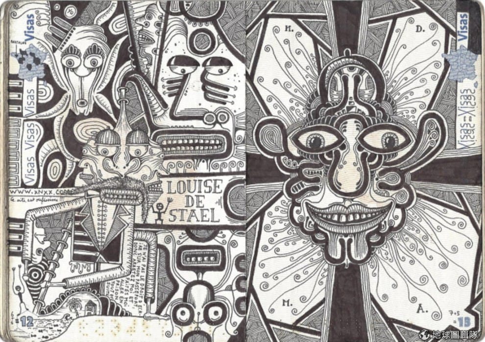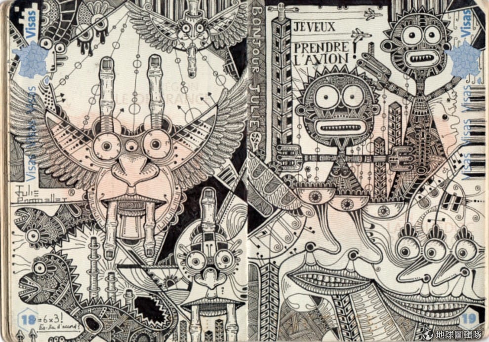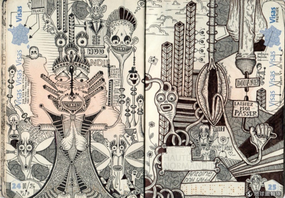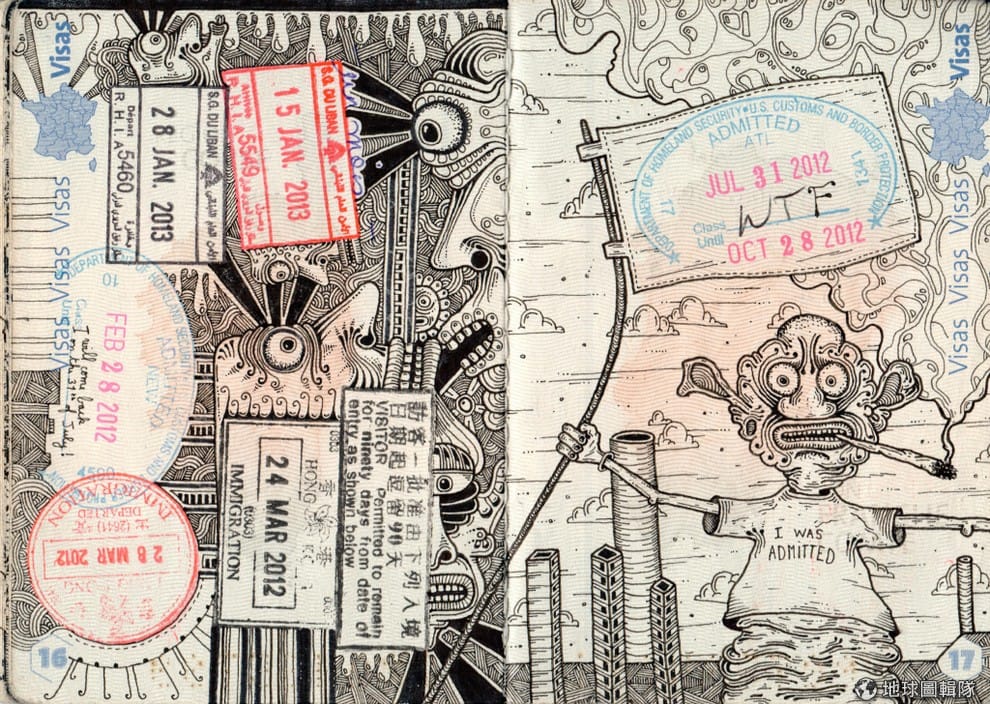 這位年僅 24歲的法國插畫家將移民局蓋的出入境戳印,和他創作的外星人、鬼怪以及大量眼球融合成了個大千世界。