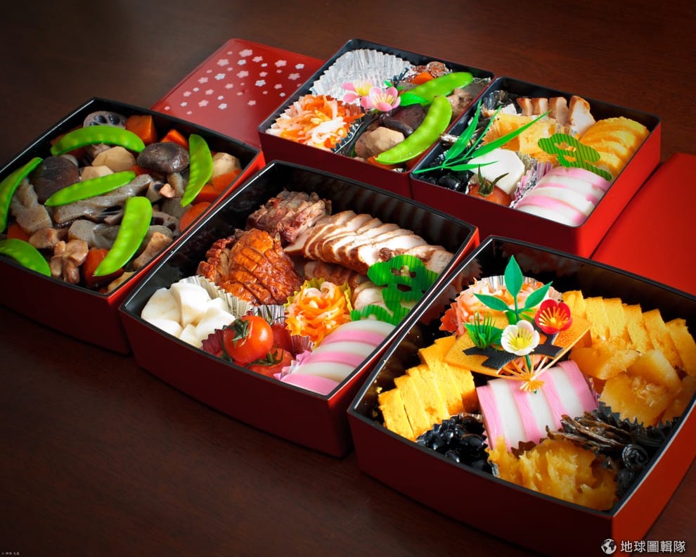 日本的傳統年菜也叫做「御節料理」或是「お節料理」,不少人應該對這類擺放在美麗漆器盒中的菜色相當熟悉,對日本家庭來說,忙碌整年的媽媽在過年時應該好好休息,於是年菜多半是已經準備好可以冷著吃的菜式,例如黑豆、牛蒡、鯛魚等等,這些象徵健康的小菜會被擺放在美麗的盒子中。有趣的是,層層疊高的年菜盒子是有意義的,例如四格就代表四季的意義。