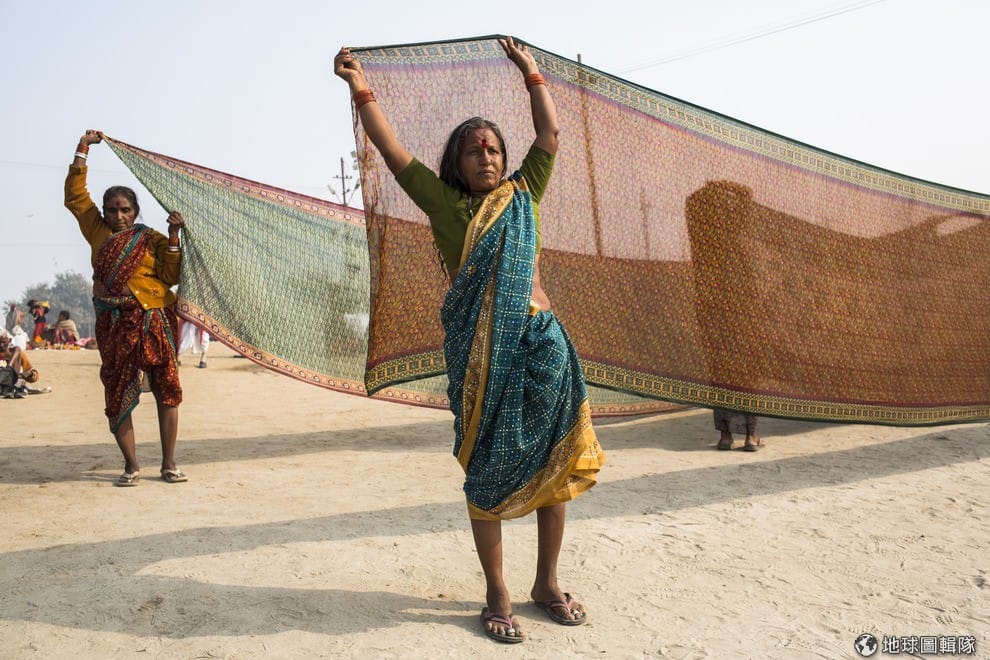 gettyimages浸泡完河水後,岸上的女信眾們正在把她們的傳統服飾「紗麗」晾乾!圖片來源:Daniel Berehulak/Getty Images