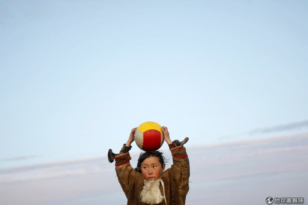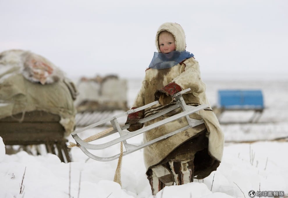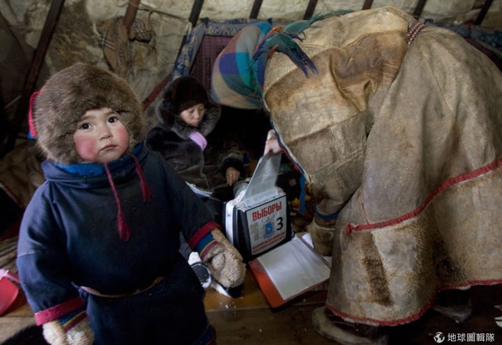 涅涅茨族的小朋友掀起蒙古包的布幔走進家裡。